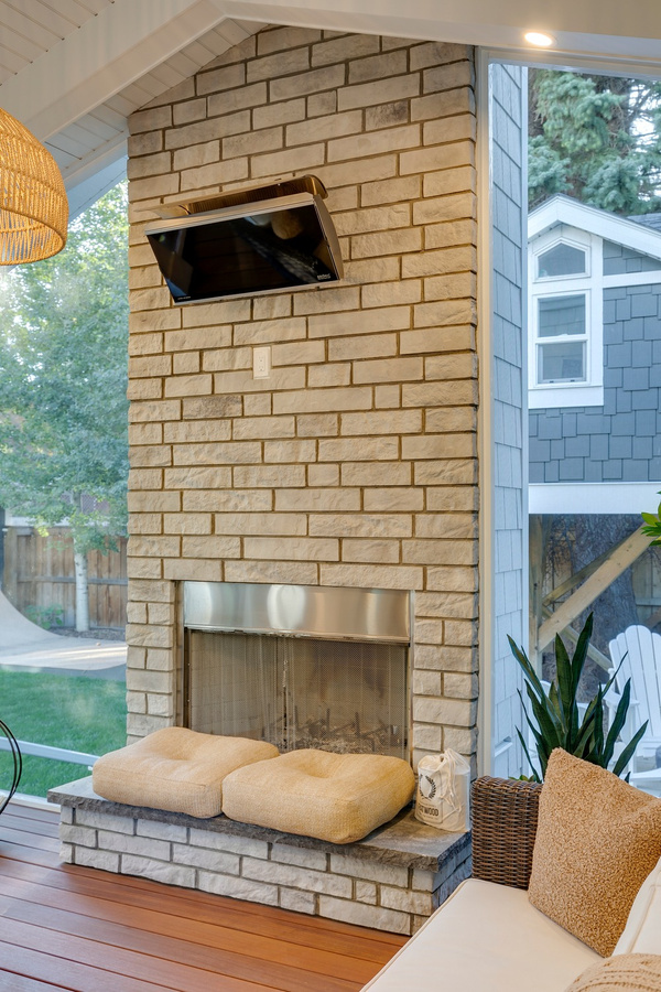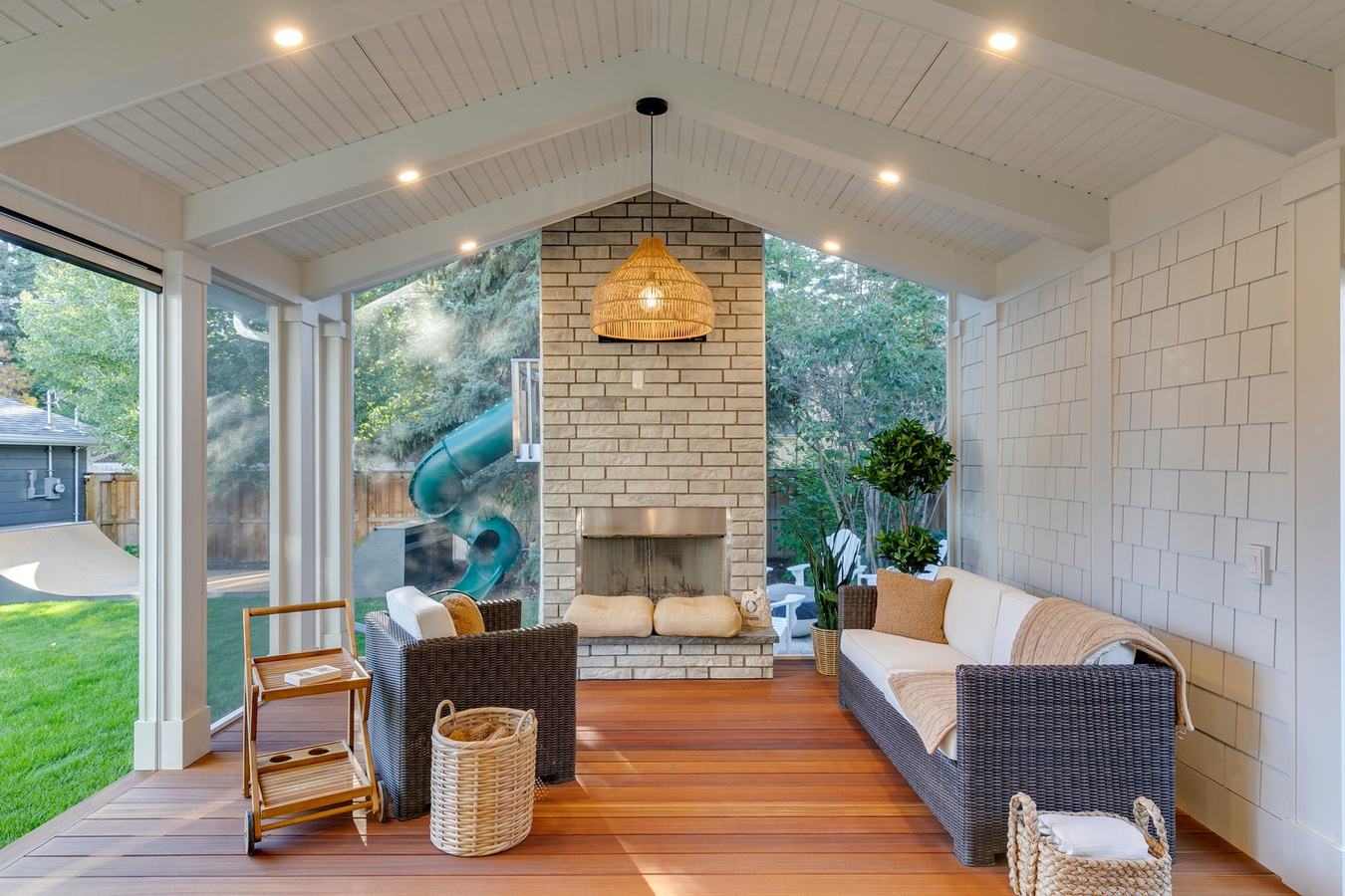 Tan StruXure featuring Bromic Heating & Phantom Screens in Sandal Wood