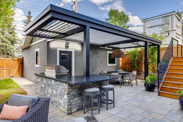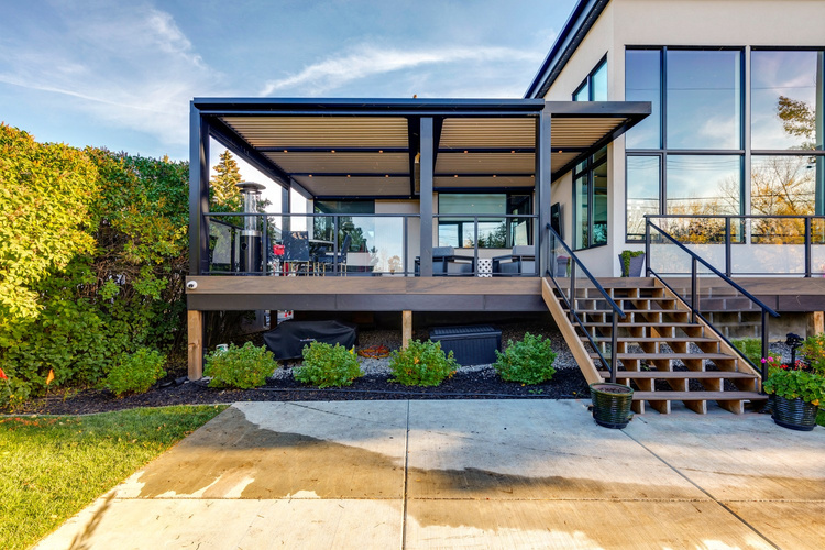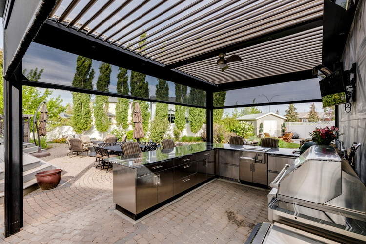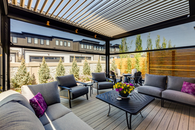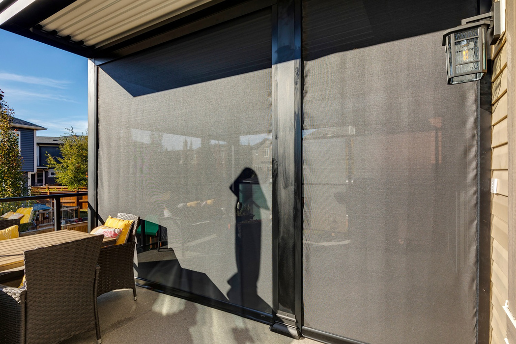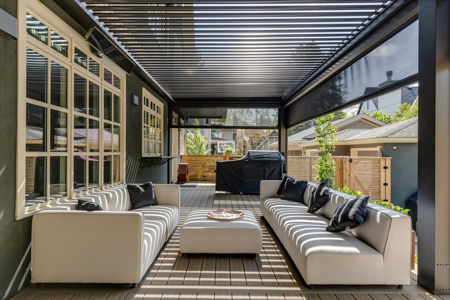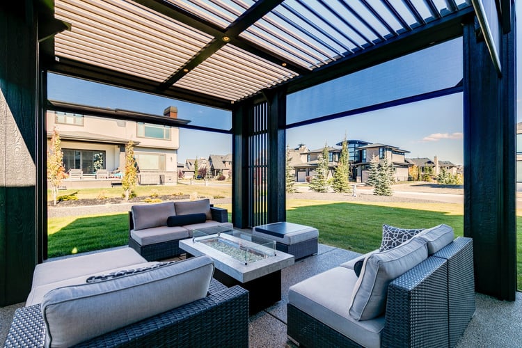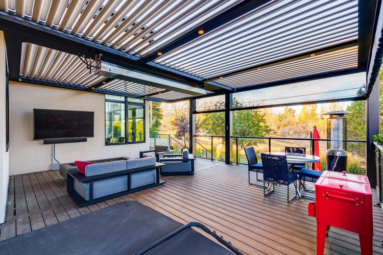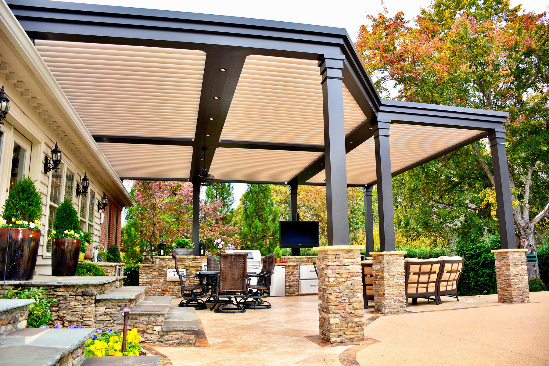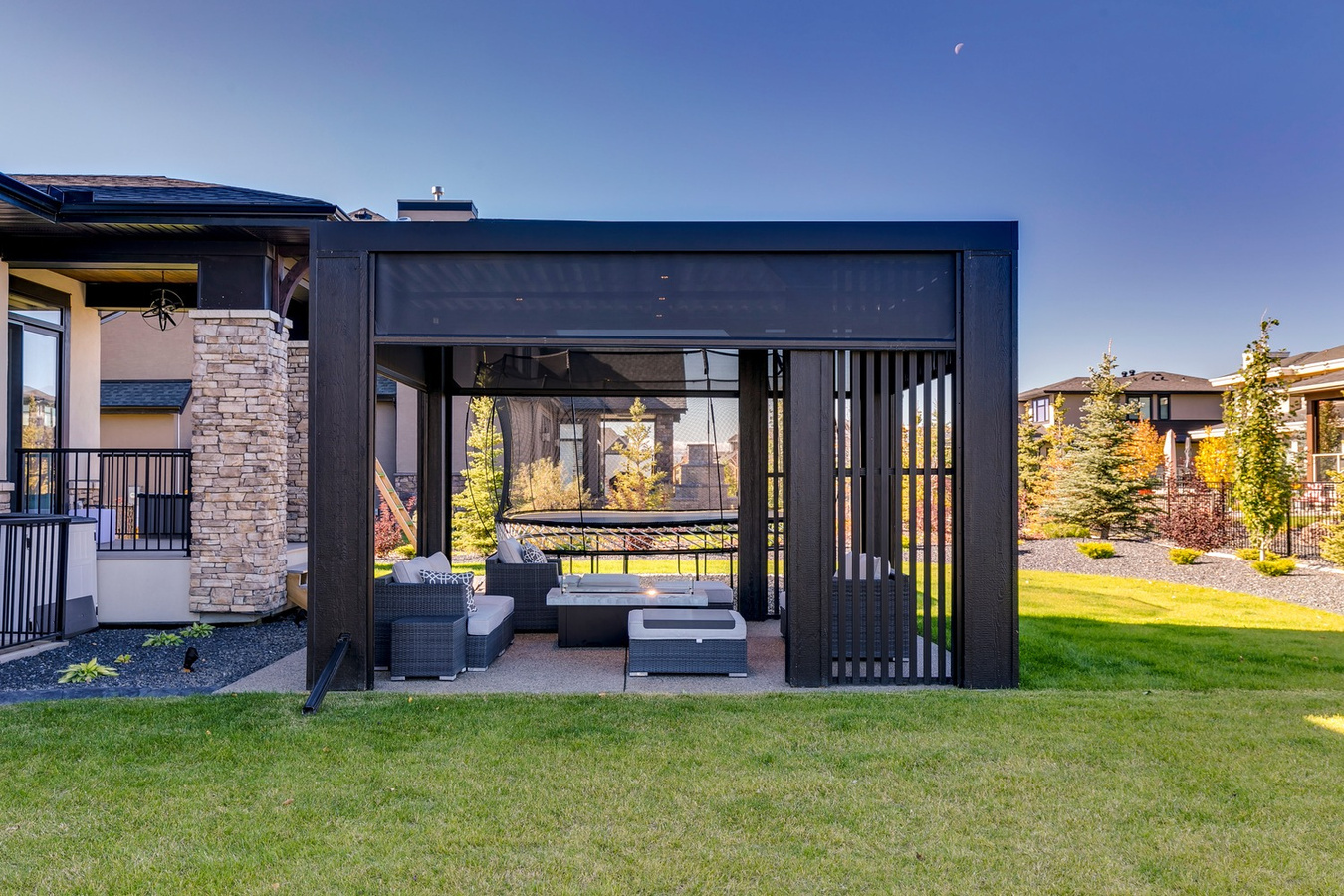 Black StruXure Pergola with Tan Louvers & Phantom Motorized Screens