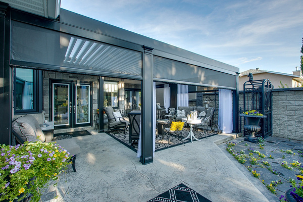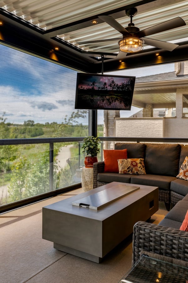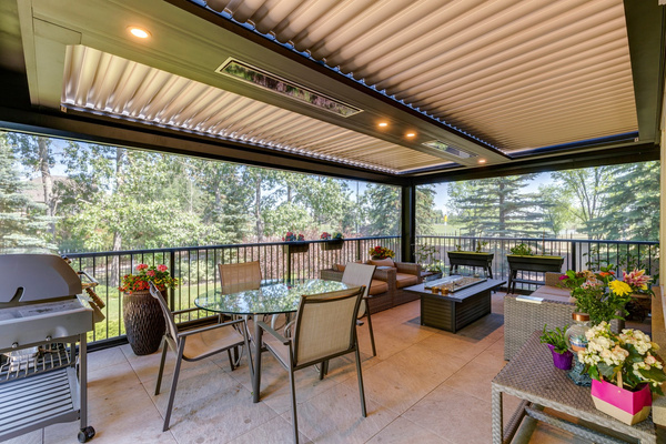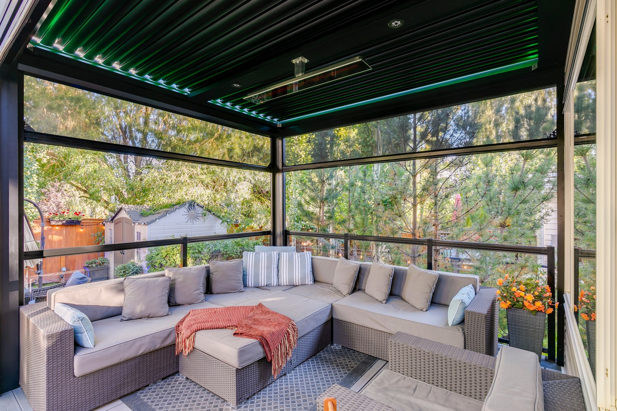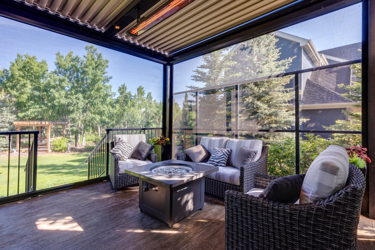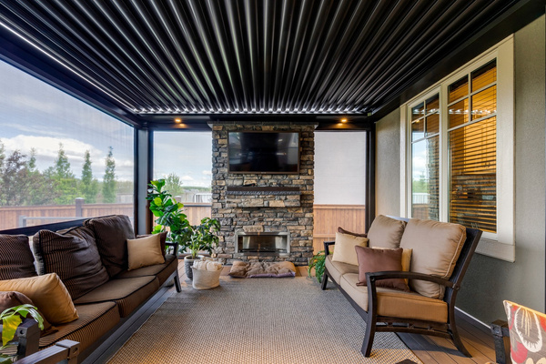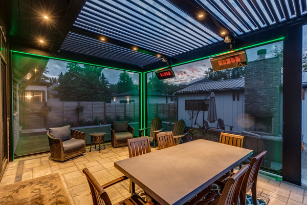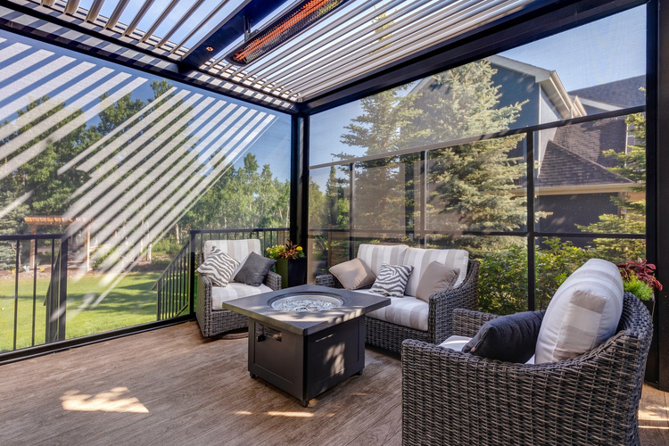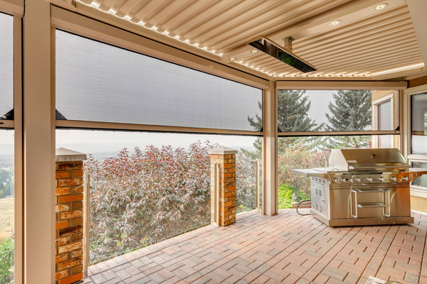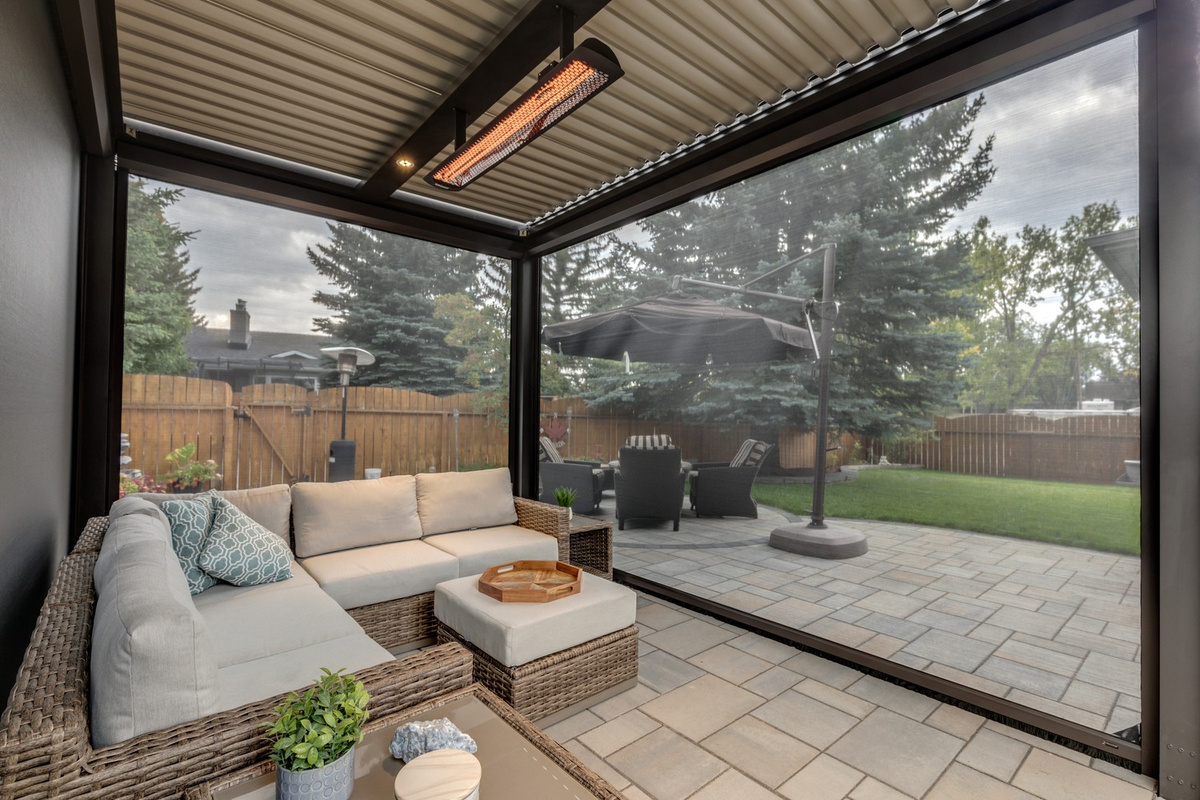 Black StruXure with Tan Louvers, Bromic Heating & Phantom Screens